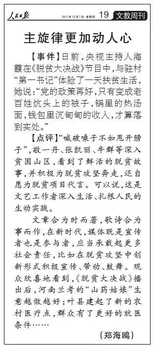 評論中還指出,文章合為時而著,歌詩合為事而作,在新時代,媒體既是宣傳者也是參與者,應(yīng)當承載起更多社會責(zé)任,比如在脫貧攻堅中創(chuàng)新形式積極宣傳、帶動、鼓舞。觀眾欣喜地看到,《脫貧大決戰(zhàn)》播出后,河南蘭考的“山藥姑娘”生意越做越好;葉縣建起了新的農(nóng)村醫(yī)療點,群眾有了更好的就醫(yī)條件……