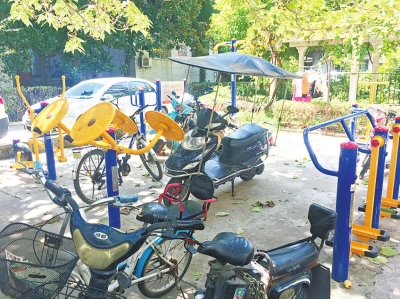健身器材被電動(dòng)車和自行車包圍