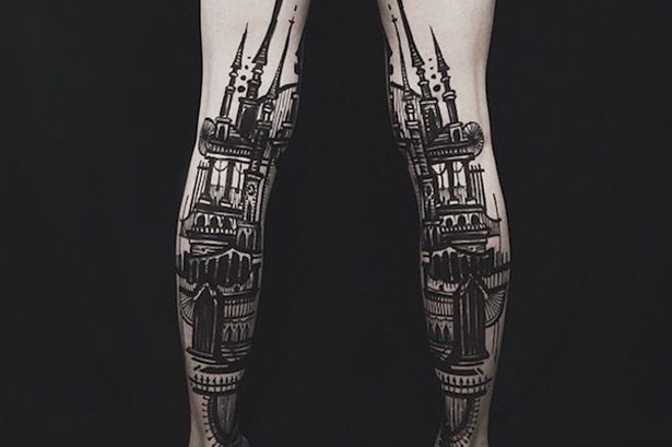 巴頓在人體的手部、胸部和腿部作畫。這套紋身作品,主要以風(fēng)景和建筑為題材,結(jié)合人體藝術(shù),利用人體的對稱感和立體感,打造視覺上的驚艷效果。